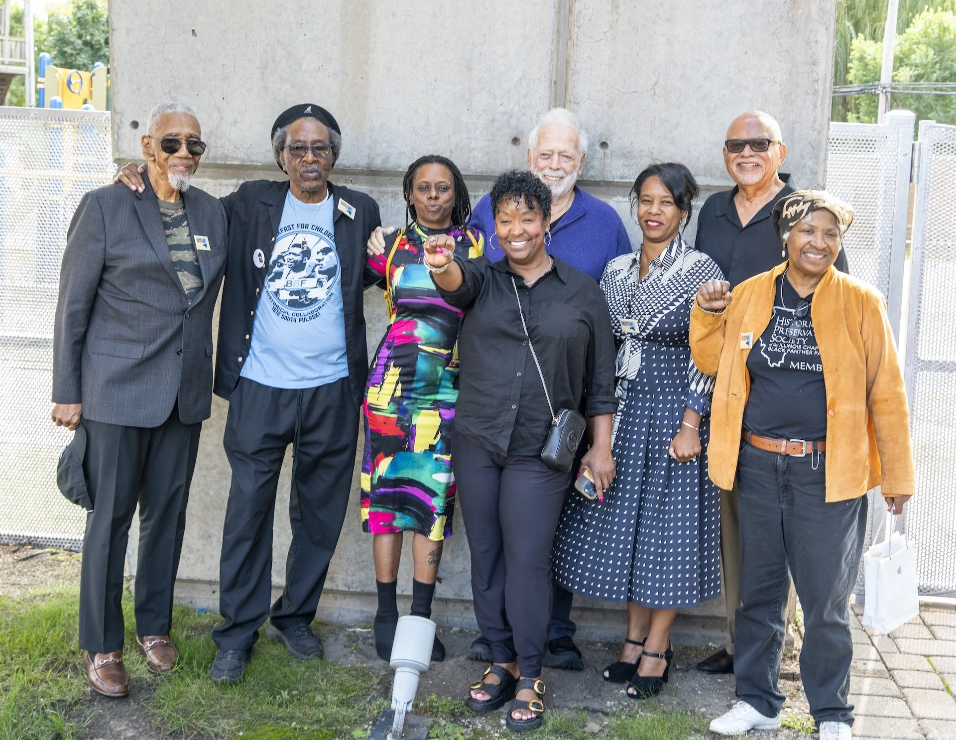 (l-r) The Honorable Bobby L. Rush, co-founder and former Deputy Minister of Defense of the Illinois Chapter, Billy “Ché” Brooks, former Deputy Minister of Education of the Illinois Chapter, New Sense, BBF Alum and rapper, Alderwoman Monique Scott, 24th Ward, Commissioner Clinée Hedspeth, DCASE, child of a Black Panther mother, Wanda Ross, former member of the Illinois Chapter of the Black Panthers, (back l-r) Jack Kellman, President of the Joseph Kellman Family Foundation, son of Joe Kellman, Troy Ratliff, EVP of the Joseph Kellman Family Foundation, Mayor Nathaniel George Booker, Maywood (not pictured)